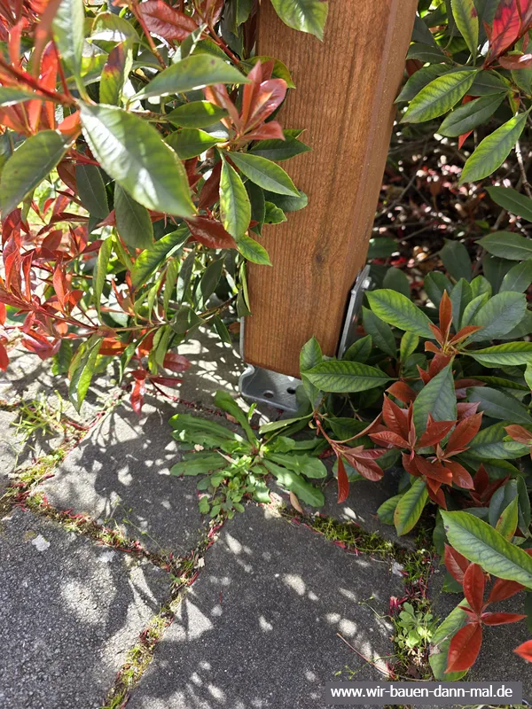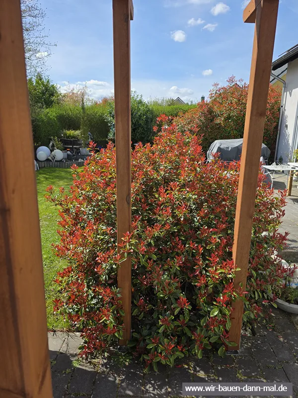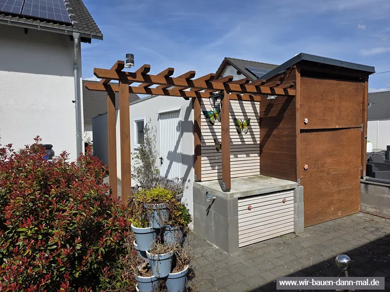 Zwischen Garage und Gartenhaus dient die Pergola nun als Durchgang und trennt den Grillplatz noch mal zusätzlich räumlich ab. Als Baumaterial haben wir Kantholzpfosten in den Stärken 7×7 cm und 9×9 cm herangezogen. Das Holz wurde nach dem Zuschneiden mit Holzschutzgel geschützt.