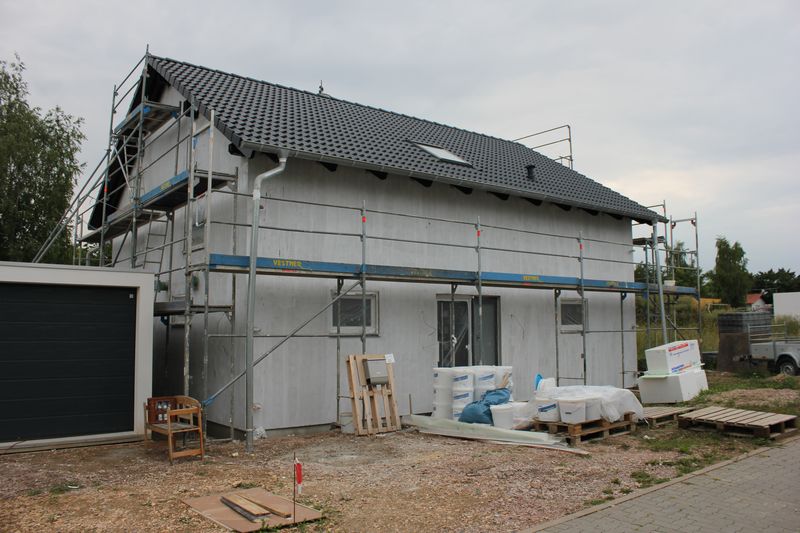 Vor dem Verputzen des Hauses muss noch die Bodenplattendämmung rund um das Haus freigelegt werden. Gestern habe ich auf der rechten und hinteren Seite des Hauses die Bodenplattendämmung vom Schotter befreit. Da an diesen Seiten noch das Gerüst steht, war es teilweise etwas schwierig mit der Schaufel ran zu kommen. Mit einer Hacke konnte man aber gut arbeiten und das Schottermaterial beiziehen. Geschätzt habe ich gut 20 Schubkarren Schottermaterial bewegt und auf einem Haufen gesammelt.