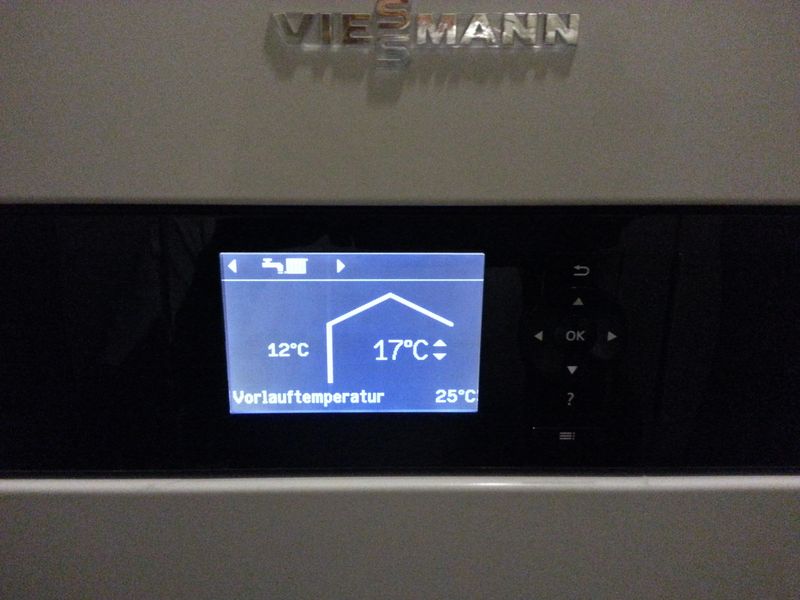 Display Viessman Vitocal HeizungDie telefonische Hilfestellung am Vortag, um die ausgefallene Heizung wieder in Gang zu bekommen, war nicht erfolgreich. Am späten Nachmittag kam dann heute erfreulicherweise ein Installateur der Firma Lorenz vorbei, um sich die Heizung anzuschauen. Die Prüfung hat ergeben, dass ein Schutzschalter (Überhitzungsschutz) ausgelöst wurde und so die Heizung nicht mehr geheizt hat. Dies wird allerdings nicht als Störung angezeigt. Die Ursache ist bleibt ungelöst. Der Installateur hat noch den Außentemperaturfühler provisorisch angeschlossen und etwa 30min. später ist die Heizung dann wieder angesprungen. Sie braucht jetzt etwa einen Tag, um wieder die gewünschte Temperatur zu erreichen. Herr K. der Firma Lorenz hat mir dann noch gezeigt, wie ich eine solche Sachlage künftig selbst beheben kann. Natürlich hoffe ich das die Heizung nicht mehr einen solchen Ausfall hat. Aber nun weiß ich ja, nach was ich schauen muss.